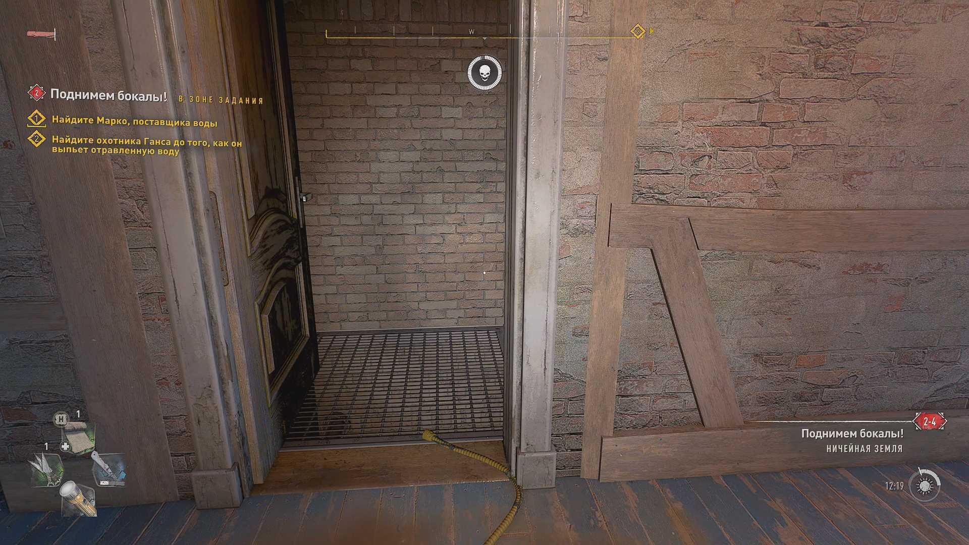 Можем вернуться на базар или спасти друга торговца от смерти. Для этого отправляемся на второй маркер и стучим в дверь. Никто не откроет, придется взломать замок. Беседуем с женой Ганса, выясняем, что он отправился на охоту к военной башне. Находим Ганса, забираем у него воду, За это он отдаст пять кусков кожи.