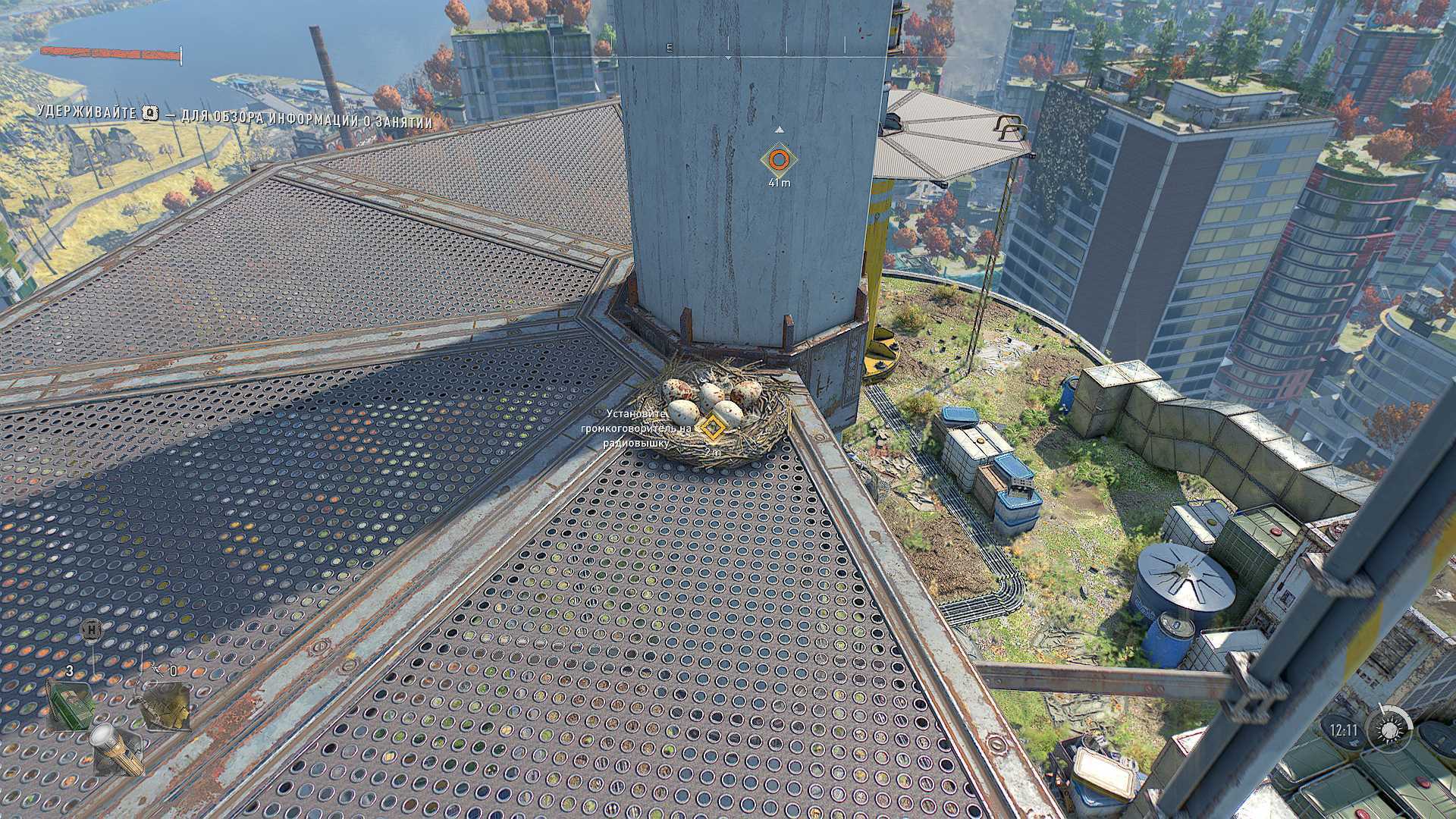 Бежим за маркером, забираемся на крышу небоскреба. Это можно сделать при помощи параплана, так как в этой области сильные ветра. Для начала забираемся на крышу здания с армейским грузом, потом прыгаем и летим на крышу небоскреба. На одной из вышек найдем гнездо. Получаем награду: 1250 очков боя, 3750 очков паркура.