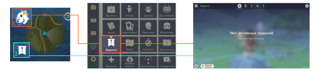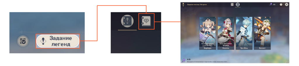 Задания легенд можно открыть через меню Паймон или нажав на значок заданий, оба значка расположены в левом верхнем углу экрана, рядом с мини-картой.