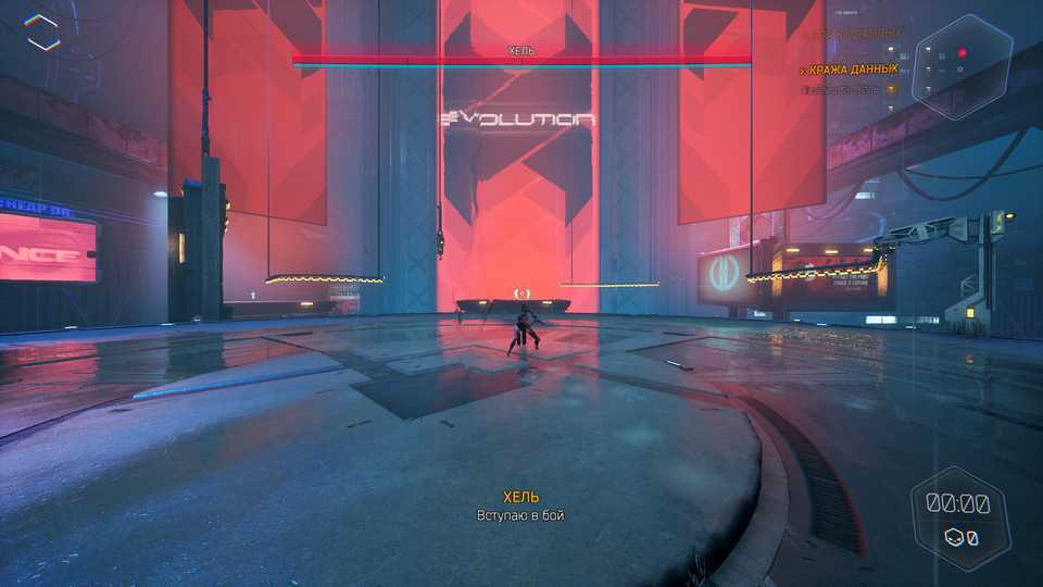 Босс является таким же киборгом самураем как и наш главный герой и по сути бой делится на 4 мини фазы, в каждой из них вам придётся парировать атаки Хель, но после того как вы запарировали её удары и нанесли свой удар, вам нужно добежать до одной из платформ на которую перепрыгнет Хель, исполняя чудеса акробатики.