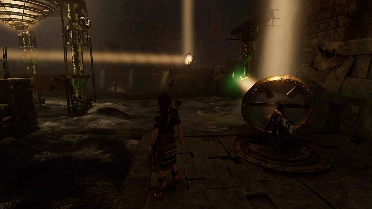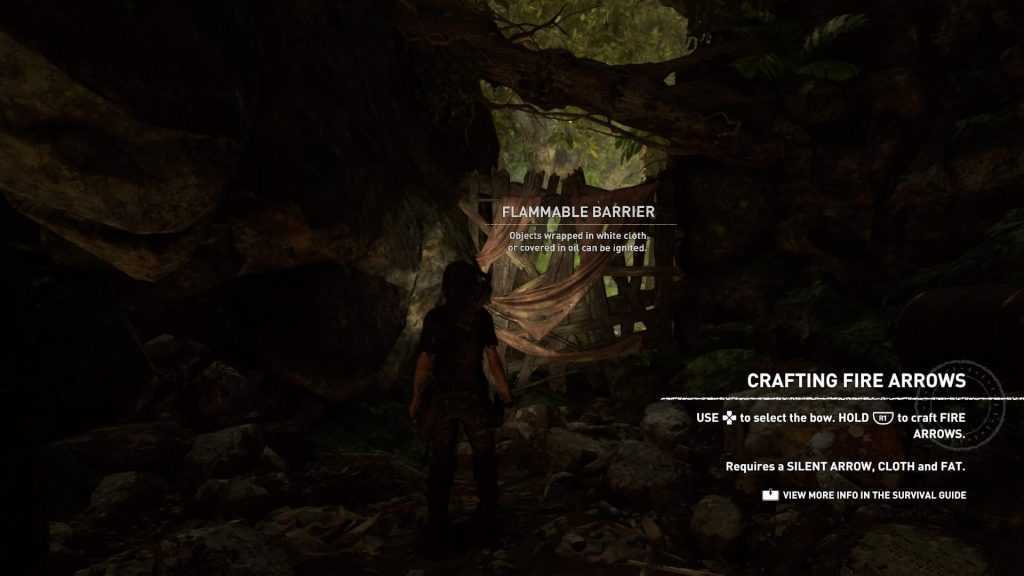 Войдя в склеп, вы окажетесь в темной комнате. Чтобы пройти дальше, достаньте свой лук и выстрелите в веревку, завернутую в тюки. В результате Лара потянет за нее и разрушит доски, блокирующие проход. Затем двигайтесь вдоль отмеченной дорожки, пока не дойдете до механизма, который открывает переходы. Используйте его и идите по левой стороне пещеры.