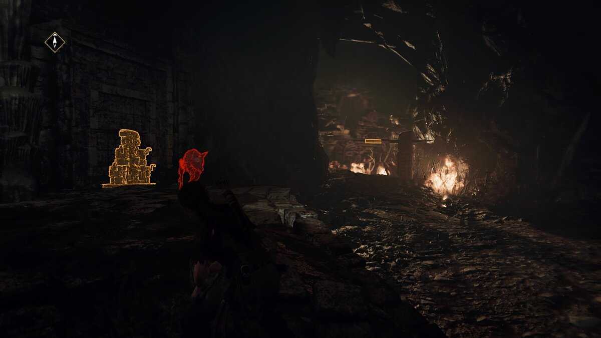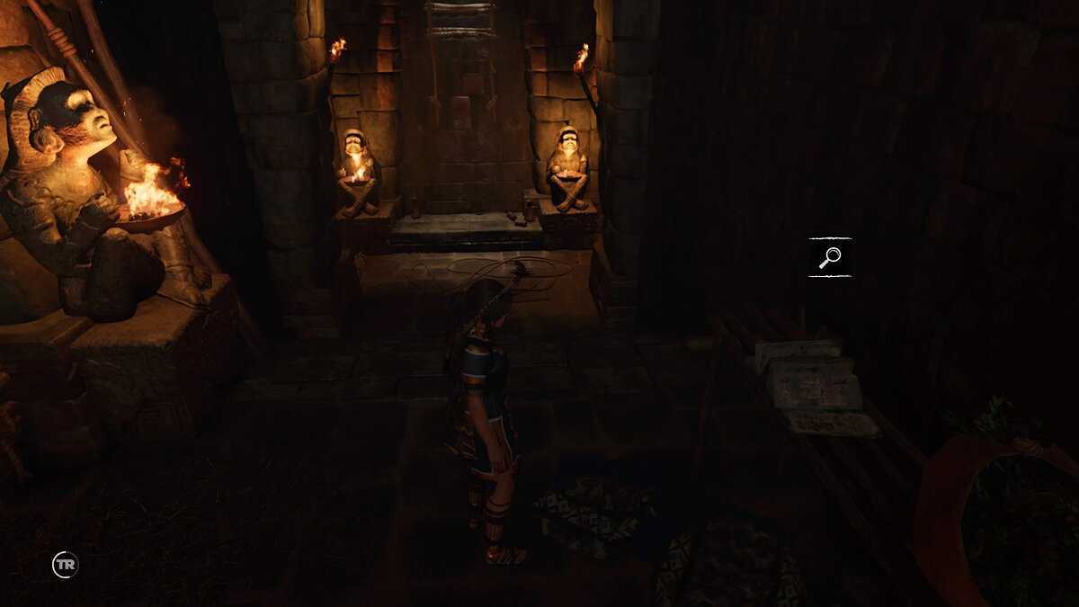 Путь преграждает деревянный барьер, так что найдите в левом углу рычаг, обмотанный веревкой, и потяните его с помощью стрел-веревок, чтобы выпустить масло. Затем нажмите переключатель в середине комнаты, чтобы выпустить огонь. Это сожжет барьер, так что идите через туннель.