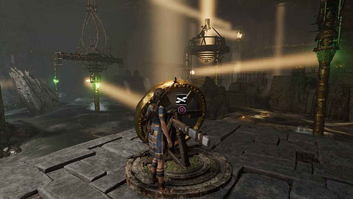 Идем дальше – в следующее просторное помещение. Ныряйте под воду, там вам нужно отвязать два плота, все так же избегая нежелательной встречи с рыбами. Потом поверните рычаг у водного колеса по часовой стрелке. Двигайтесь к платформе с веревкой, выстрелите из лука в специальный металлический круг, расположенный над воротами – это позволит связать вместе два разных элемента.