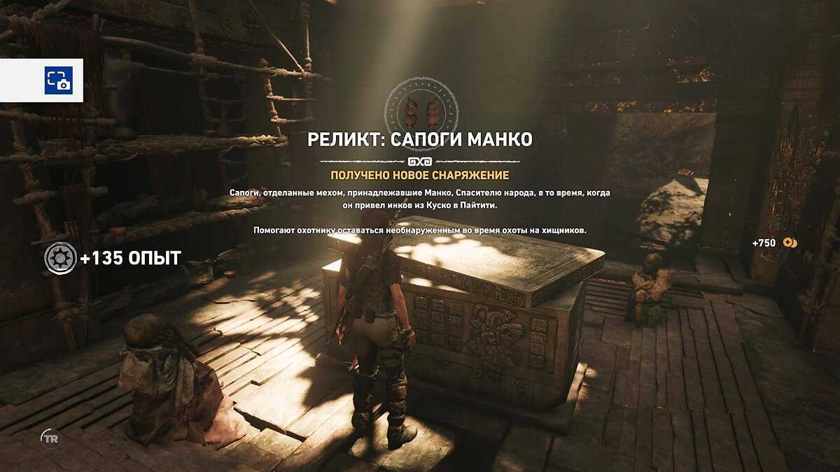 Внутри первым делом отыщите сундук, внутри которого будет лежать первая реликвия под названием «Могильный камень». К слову, можно также найти и фреску, которая после использования (впрочем, как и камень), даст возможность разборчивей разбираться в диалекте местного народа кечуа.