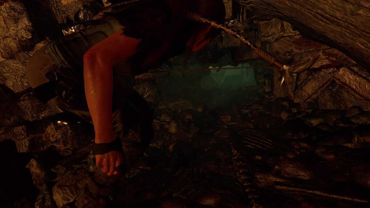 Идите вперед. В конце пещеры будет крутой спуск, после которого нужно успеть прыгнуть и ухватиться ледорубами за скалу. Спуститесь по веревке, раскачайтесь и прыгайте на небольшую площадку. Ухватитесь за уступ в стене и спускайтесь еще ниже. Подойдите к небольшому отверстию в стене чтобы Лара проползла. После очередного спуска вас ждет поединок с несколькими животными, похожими на лис. После боя изучите фреску и подойдите к обрыву с горящей нефтью. При помощи лука соорудите веревочный лаз.