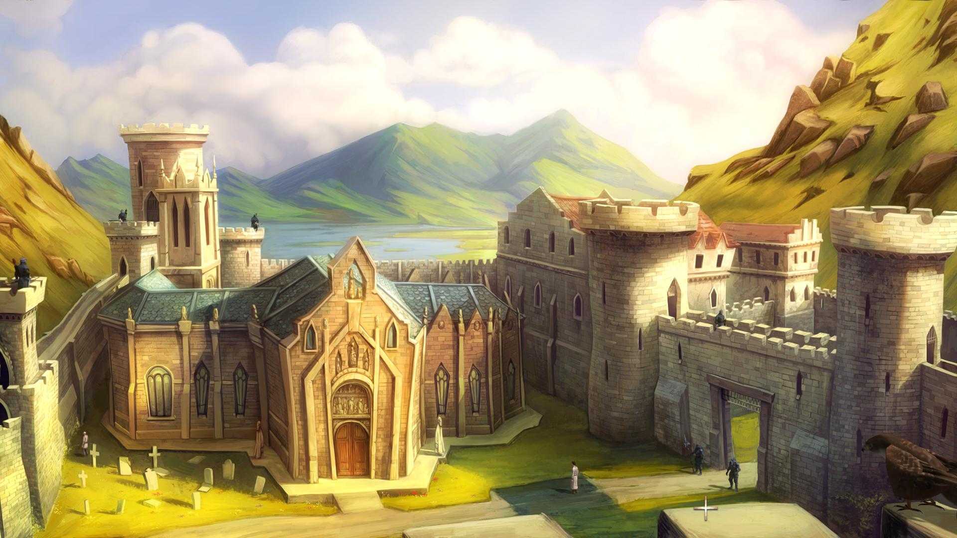 После диалога с Кэйтир оказываемся возле церкви и заходим в неё. Осматриваем гербовый щит по центру стены, берём ключ и открываем им соседнюю правую (со стороны героя) дверь. В залитой солнечным светом комнате находим арбалет и стрелы возле постаментов святых, а затем спускаемся в ритуальный зал.
