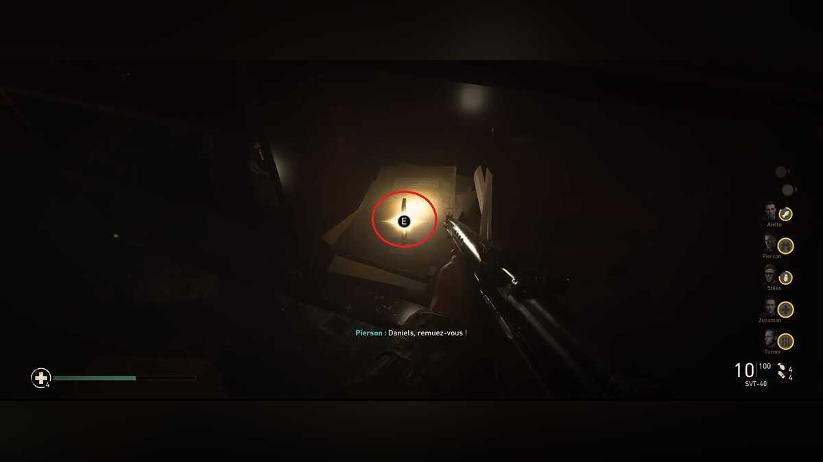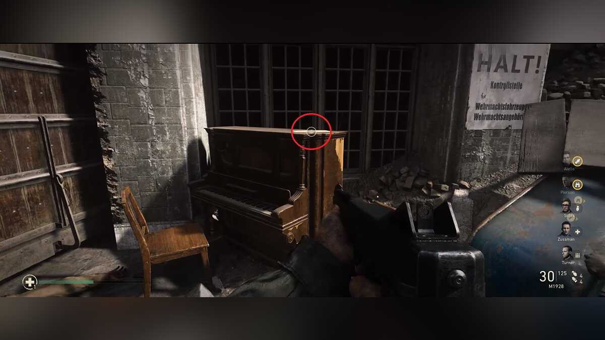 Пока вы пытаетесь противостоять немецкому наступлению, вас будут оттеснять к дальней стороне моста. Около этого места упадет солдат союзников. Прислушайтесь к его крику, чтобы опознать его, поскольку он не всегда падает в одном и том же месте. Перетащите его в безопасное место, чтобы стать героем. Цель: Устранить снайпера