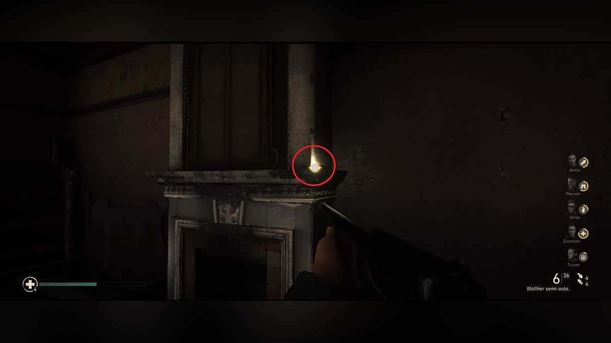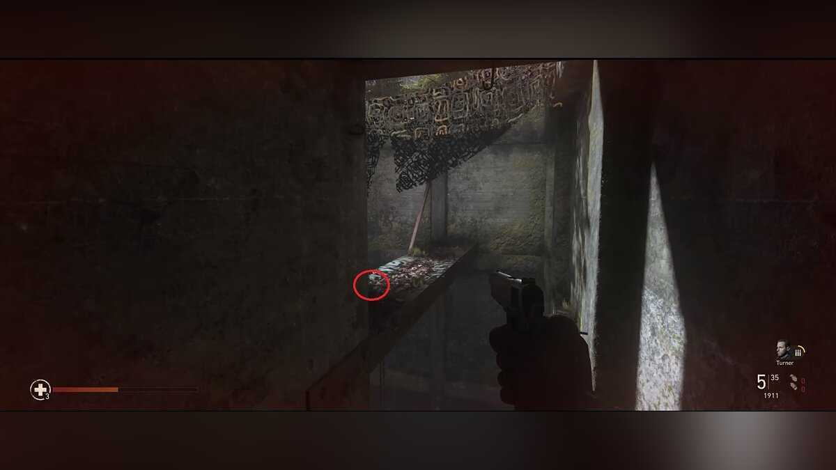 Когда вы попадете в дом, где можно будет совершить подвиг (спасти товарища от нациста). Нам нужно попасть на второй этаж через отверстие в потолке, забравшись по насыпи из остатков деревянных конструкций. Сам сувенир лежит в дальнем конце этаже, куда мы должны добраться по обломкам.