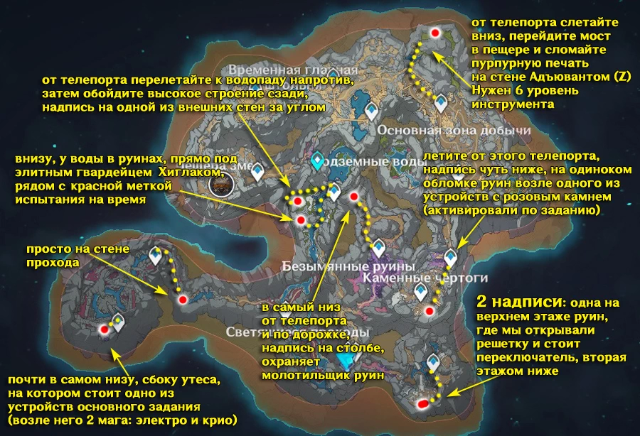 Нужно найти и прочитать девять надписей на камнях шахт Разлома. Искать их несложно и большинство встречается в процессе выполнения заданий.
