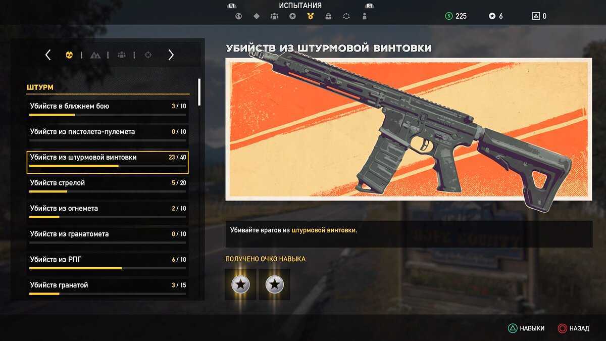 - Завершение испытаний. В меню главного героя имеется отдельная вкладка, в которой перечислены все испытания и условия их прохождения. Награда за завершенное испытания составляет 1-3 очка. Чем сложнее испытание, тем выше награда. В игре предусмотрены разные испытания. Определенное количество убийств из конкретного оружия, убийства определенным способом (с высоты, транспортом и т. п.), охота на различных животных, ловля конкретной рыбы и друге. На начальном этапе стоит проходить самые простые испытания. Это позволит купить наиболее полезные перки для усиления главного героя и дальнейшего выполнения более сложных испытаний.