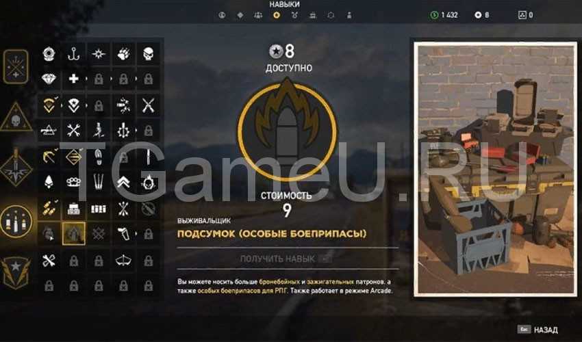 - Походный рюкзак (стоит 7 очков навыков) — позволяет вашему персонажу носить больше важных предметов, включая аптечки для восстановления здоровья;