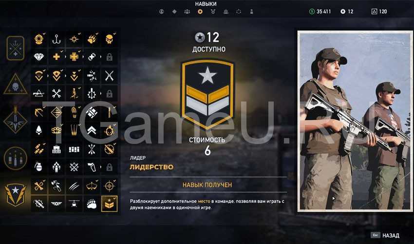 - Лидерство (стоит 6 очков навыков) — позволяет брать с собой не одного, а двух специалистов или наемников, благодаря чему вы получаете больше бонусов при сражении с противниками;