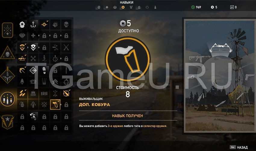 - Дополнительная кобура (стоит 8 очков навыков) — добавляет возможность носить с собой три вида оружия любого типа (изначально вы можете носить только две пушки);