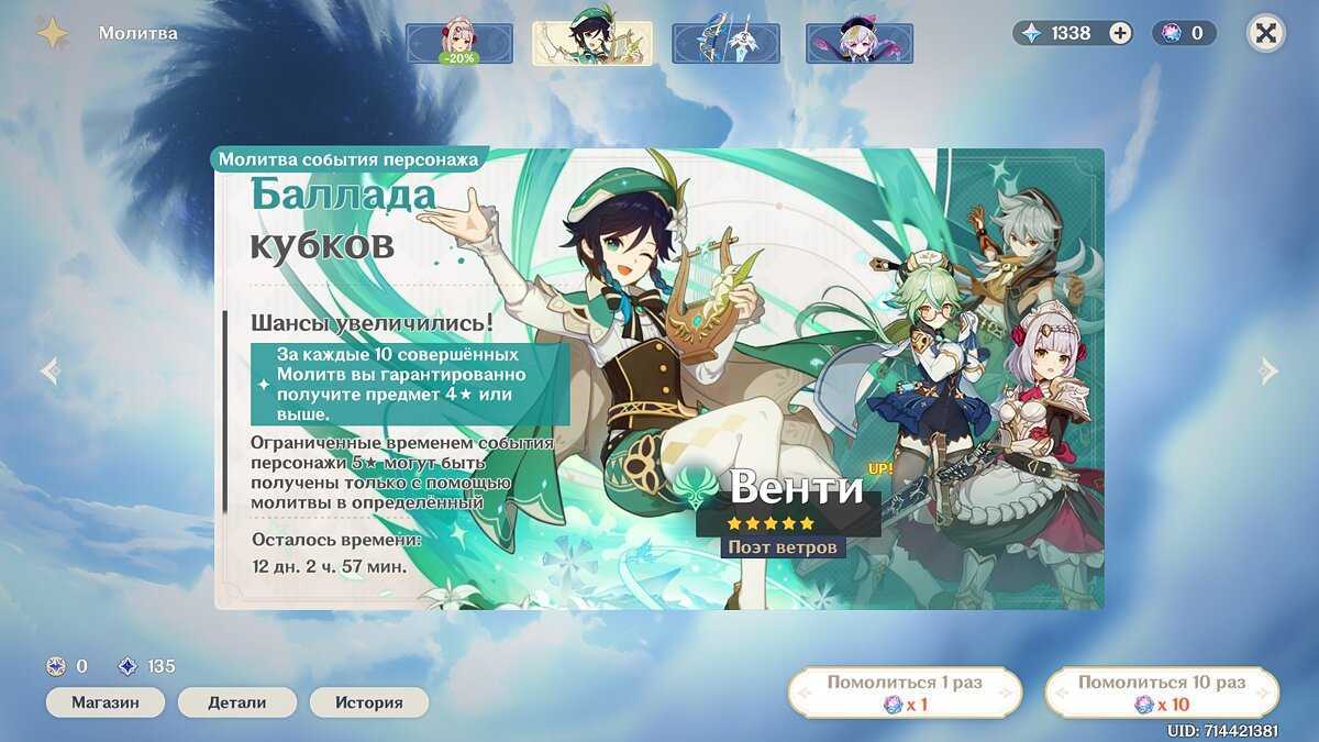 Учитывая, что Венти — пятизвездочный персонаж, он является чрезвычайно редкой наградой. Вам нужно использовать ограниченную по времени молитву «Баллада кубков» (Ballad in Goblets). Шансы получить персонажа составляют жалкие 0,6 процента.