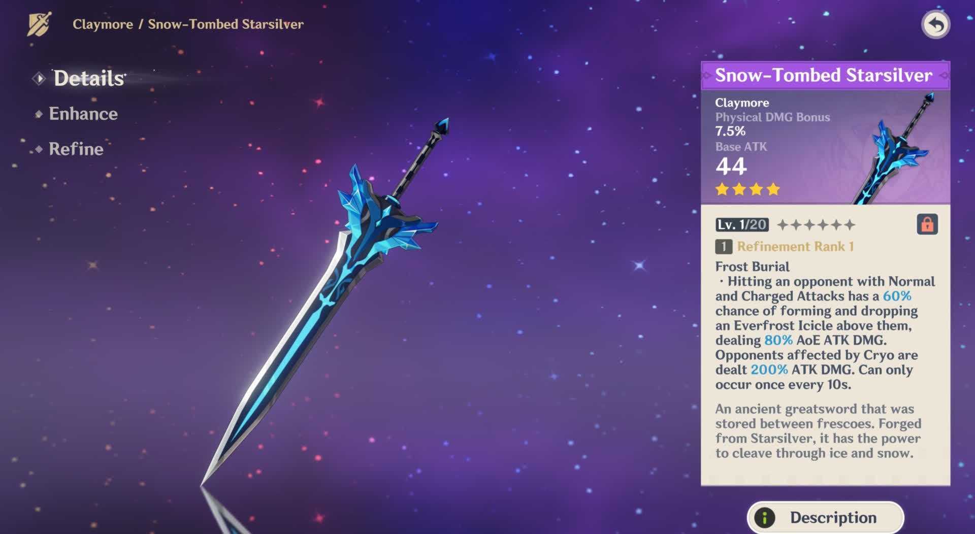 Заснеженное звёздное серебро (физ. урон) — если вы не планируете тратить камни истока или деньги, то этот двуручный меч можно использовать в качестве бесплатной замены. У оружия есть шанс сбросить на врагов ледяной кристалл, если вы поразите их обычными или заряженными атаками. Урон значительно увеличивается, если на врагов действует элемент Крио (которого будет в избытке, если вы действуете Эолой).