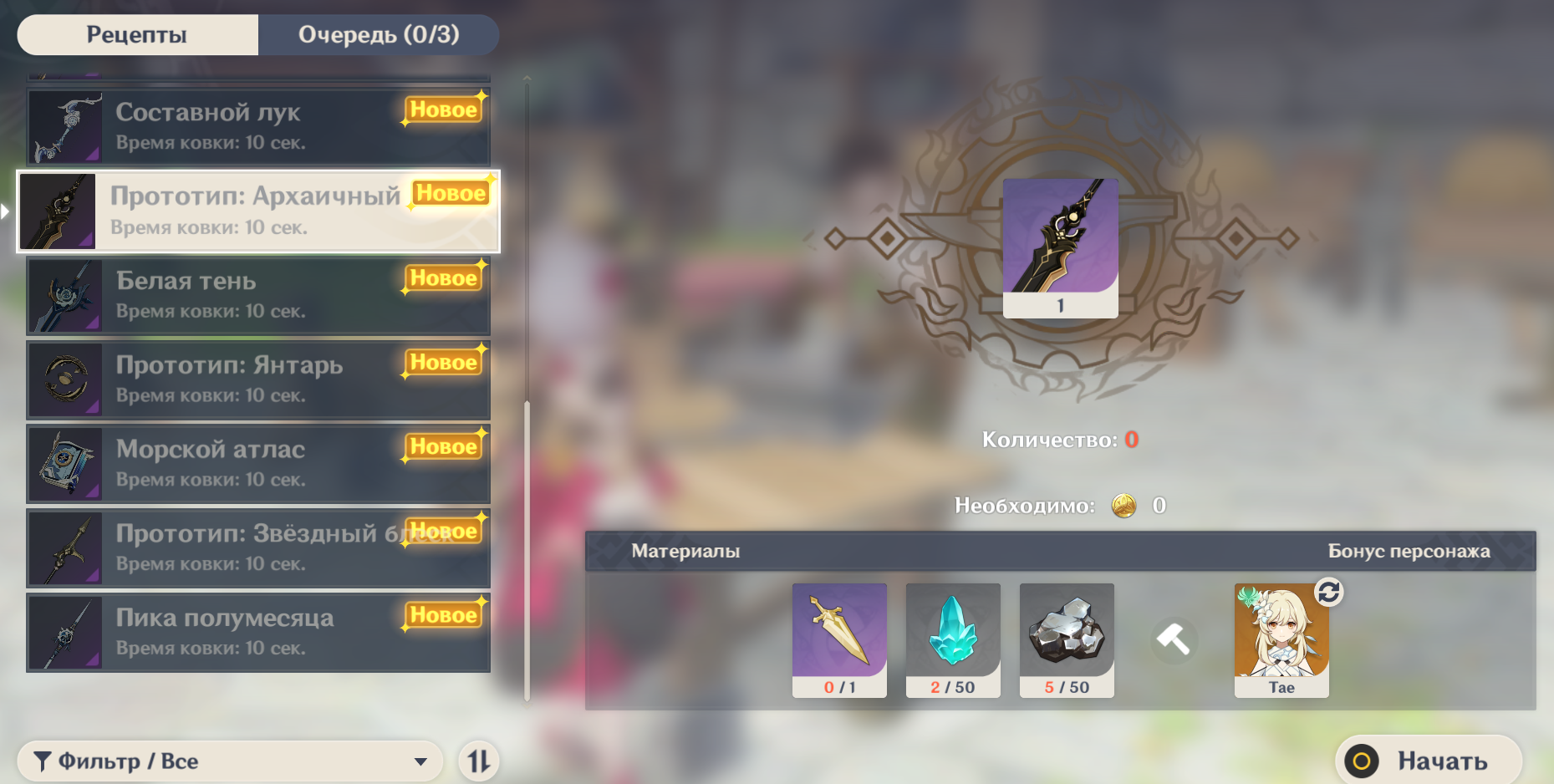Когда вы еще не очень понимаете, какое именно оружие вам нужно, и какими героями вы будете играть, не торопитесь крафтить все подряд. Берите наиболее универсальные предметы, которые можно будет передать другому герою, если он у вас появится. Со временем, определившись с предпочтениями в плане персонажей, вы сможете уже более осознанно выбрать из списка крафтового оружия подходящее для своего героя. Или не выбрать: 4* мечи, луки, катализаторы и т. д. падают с баннеров не так редко, как кажется.