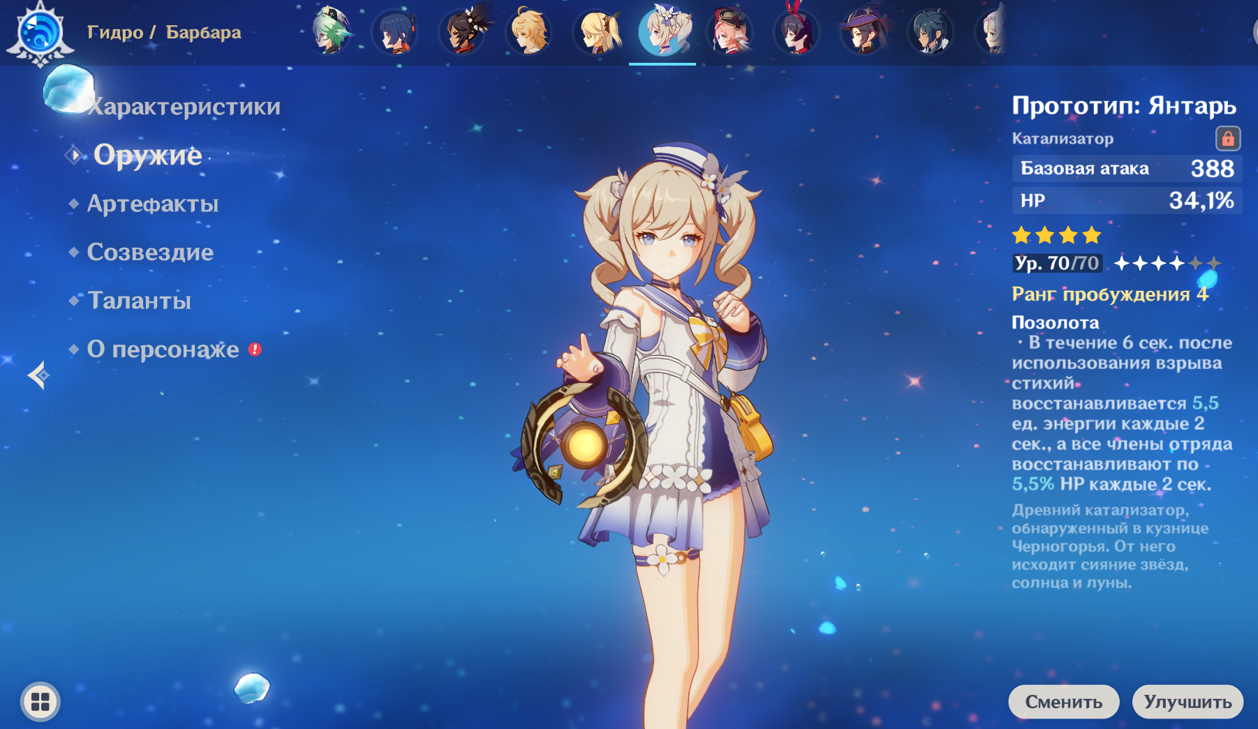 Почему именно они? «Белая тень» и «Янтарь» имеют второй стат защиту и HP соответственно. Именно от этих параметров рассчитывается лечение Ноэлль и Барбары. Остальное оружие просто достаточно универсальное: у мечей и лука второй стат — сила атаки, а у копья — восстановление энергии. Тот же бонус физ. урона в «Составном луке» — куда менее универсальный параметр, который подойдет не для каждого персонажа. А вот «Прототип: Архаичный» можно дать любому мечнику, заточенному под урон, и результат будет неплох.