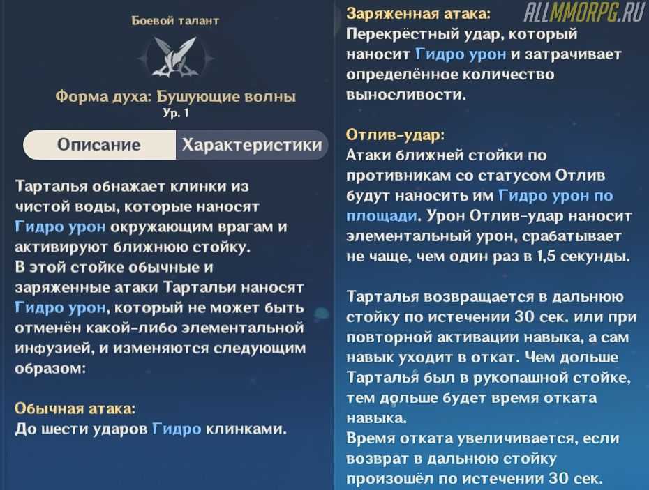 Активация способности «Форма духа: Бушующие волны» переводит Тарталью в режим ближнего боя. Герой достает клинок и начинает наносить врагам огромный гидро-урон.