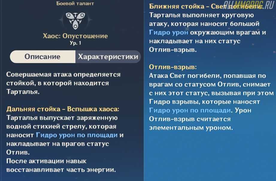 При активации убирается лук, берутся клинки. После активации атаки будут наносить урон всем ближайшим соперникам. При атаке в ближней стойки все, кто имеют статус Отлива, получают метку, которая увеличивает по ним урон. Работает данный эффект раз в почти две секунды. Используя стойку с ближнем бою, можно продолжить так битву 30 секунд. Затем процесс перезарядки напрямую зависит от времени, которое в ней провел пользователь. Рекомендуется проводить в стойке менее 15 секунд, ведь если нарушить такую рекомендацию, с персонажа исчезают все полученные преимущества, которые выливаются в дополнительный урон. Хаос: Опустошение — стихийный взрыв героя, который зависит от активной стойки. При дальней атаке герой может атаковать заряженной стрелой. Она наносит гидро-урон по площади, отмечая Отливом всех соперников, которые были задеты. Часть затраченной энергии возвращается. При использовании ближней стойки Тарталья позволит осуществить круговую атаку. Это сулит гидро-урон каждому сопернику, взорвав все отметки, установленные ранее. Рассматривая последнюю способность: в ближней стойке взрыв стихии смотрится куда сильнее! Если Тарталья выступает в роли помощника, этот навык обязательно должен быть изучен самым первым из всех.