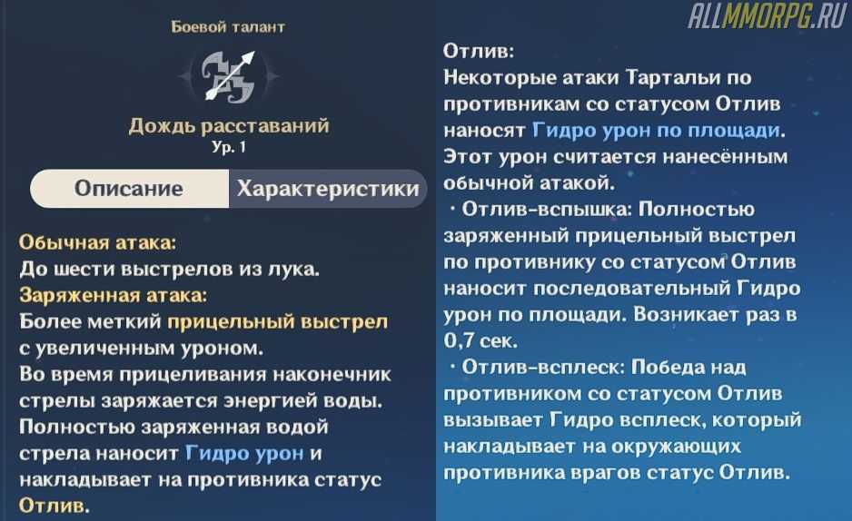 При использовании умения «Дождь расставаний» Тарталья совершает 5 последовательных выстрелов из лука по цели. Если герой нанесет противнику урон заряженной атакой, то наложит на него дебафф «Отлив». Последующие атаки по цели с дебаффом «Отлив» с определенной вероятностью нанесут нестихийный АОЕ-урон.