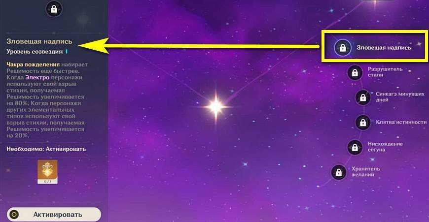 Если вы хотите узнать, какое из созвездий за что отвечает у конкретного персонажа, то просто нажмите на него. Слева откроется окошко с описанием. Это можно сделать даже в том случае, если конста не активирована.