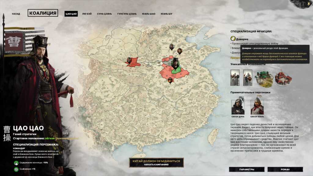 В Three Kingdoms каждая фракция реализована действительно уникально в какой-то степени, а не сделана по формуле “количество ради количества”. Также каждая фракция имеет интересную предысторию и принадлежит к одному из шести типов. Каждый тип фракции, а иногда и отдельно взятая фракция, ставит свои вызовы игроку, обозначает его стартовое положение и стиль игры. В конечном же счёте победа для всех одна.